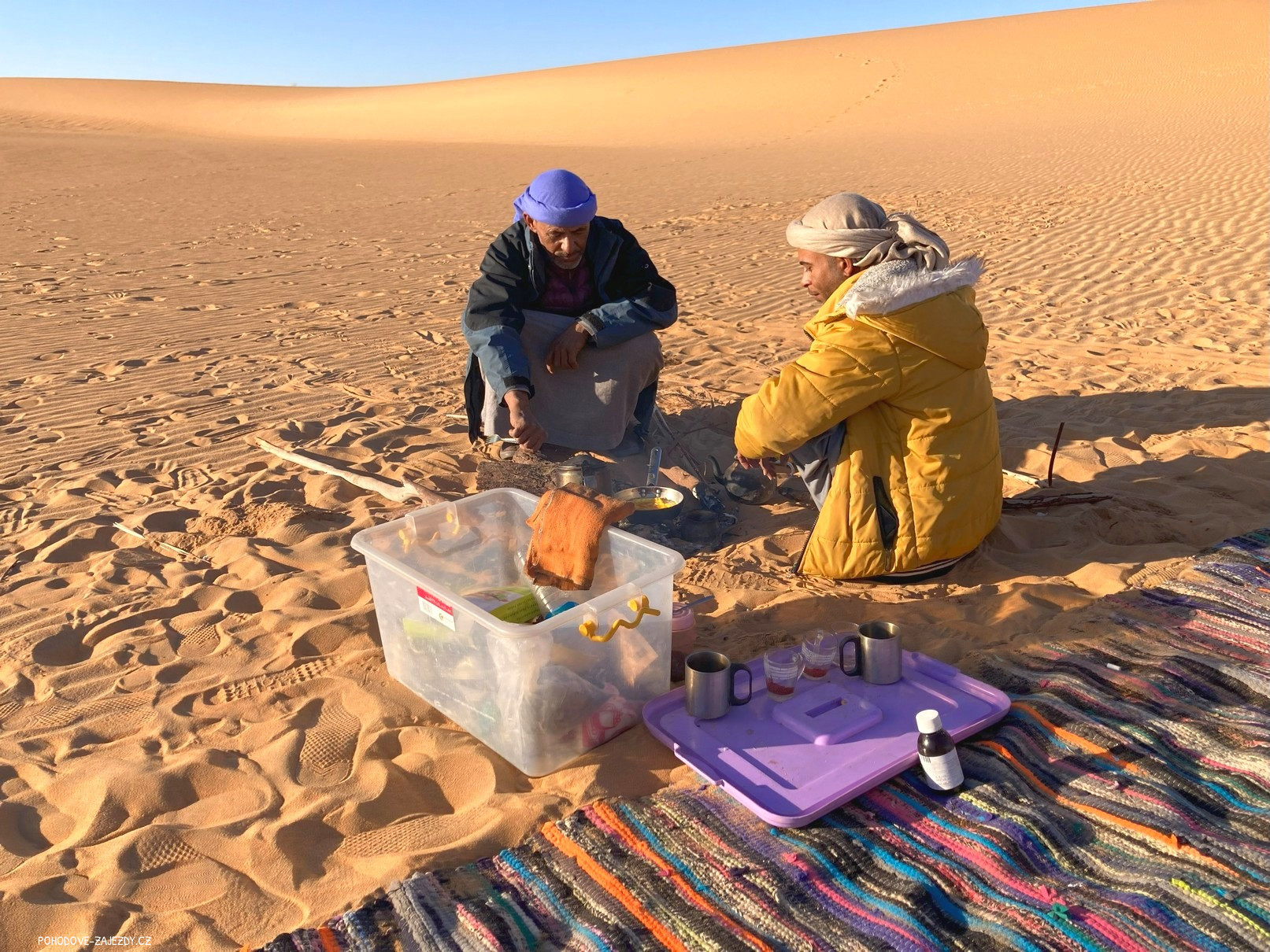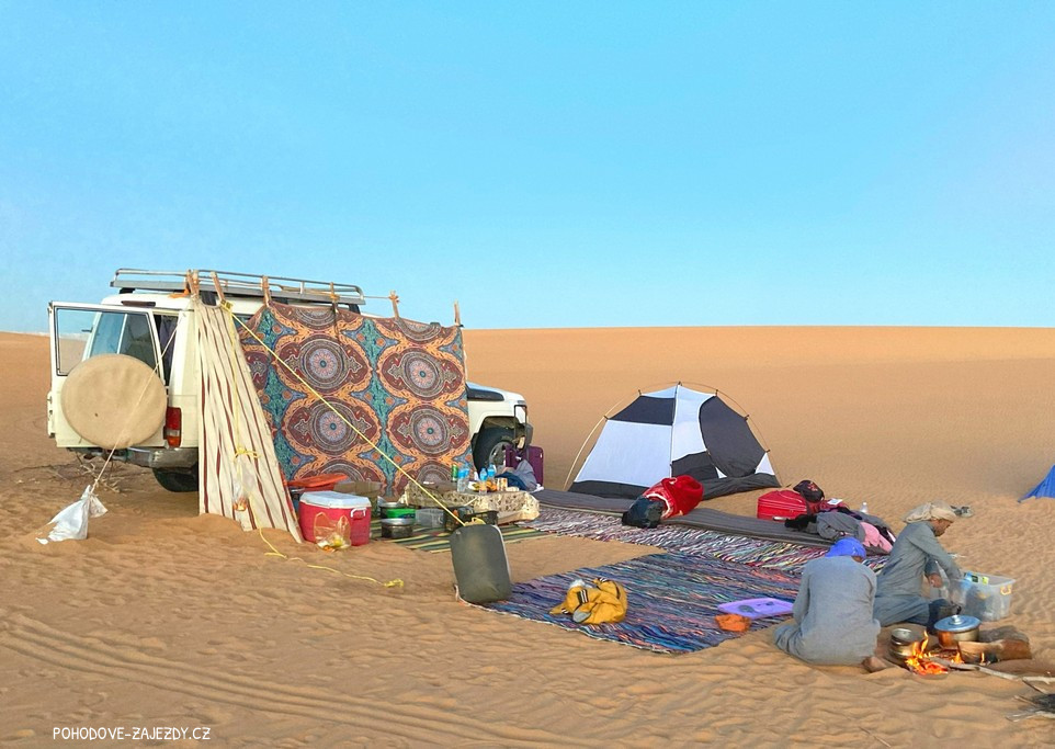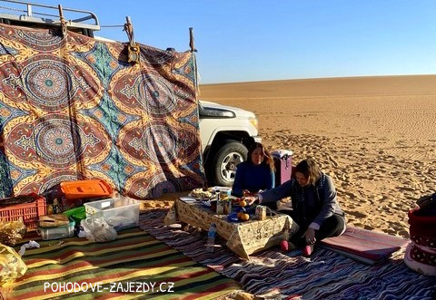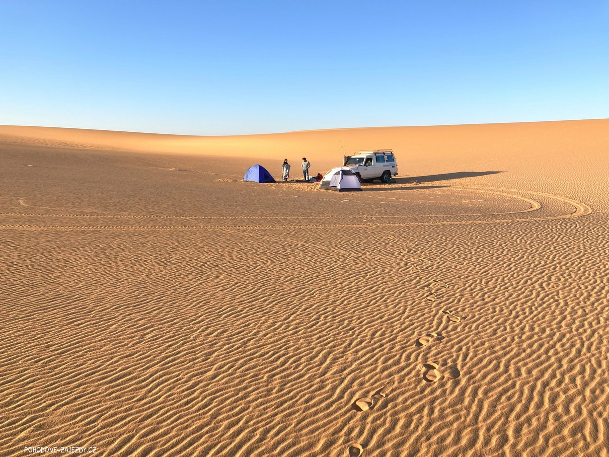 Změna pořadí programu vyhrazena. Na tuto výpravu má vliv spousta podmínek, jak povětrnostních tak faktických. Písek v poušti se mění podle teploty vzduchu, duny se přesýpají dle větru. Je zcela běžné a obvyklé, že džíp zapadne v písku a pak je nutné ho vyprostit. Nelze dopředu odhadnout, jak dlouho tato činnost bude trvat a na základě toho se bude odvíjet program. Proto nelze odhadnout časy odjezdů a příjezdů.