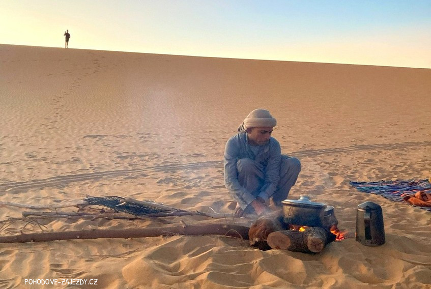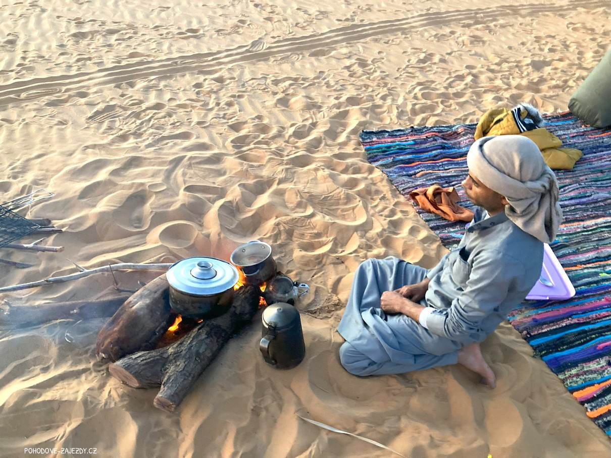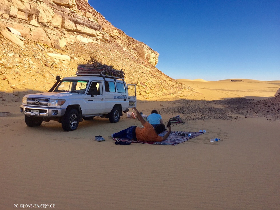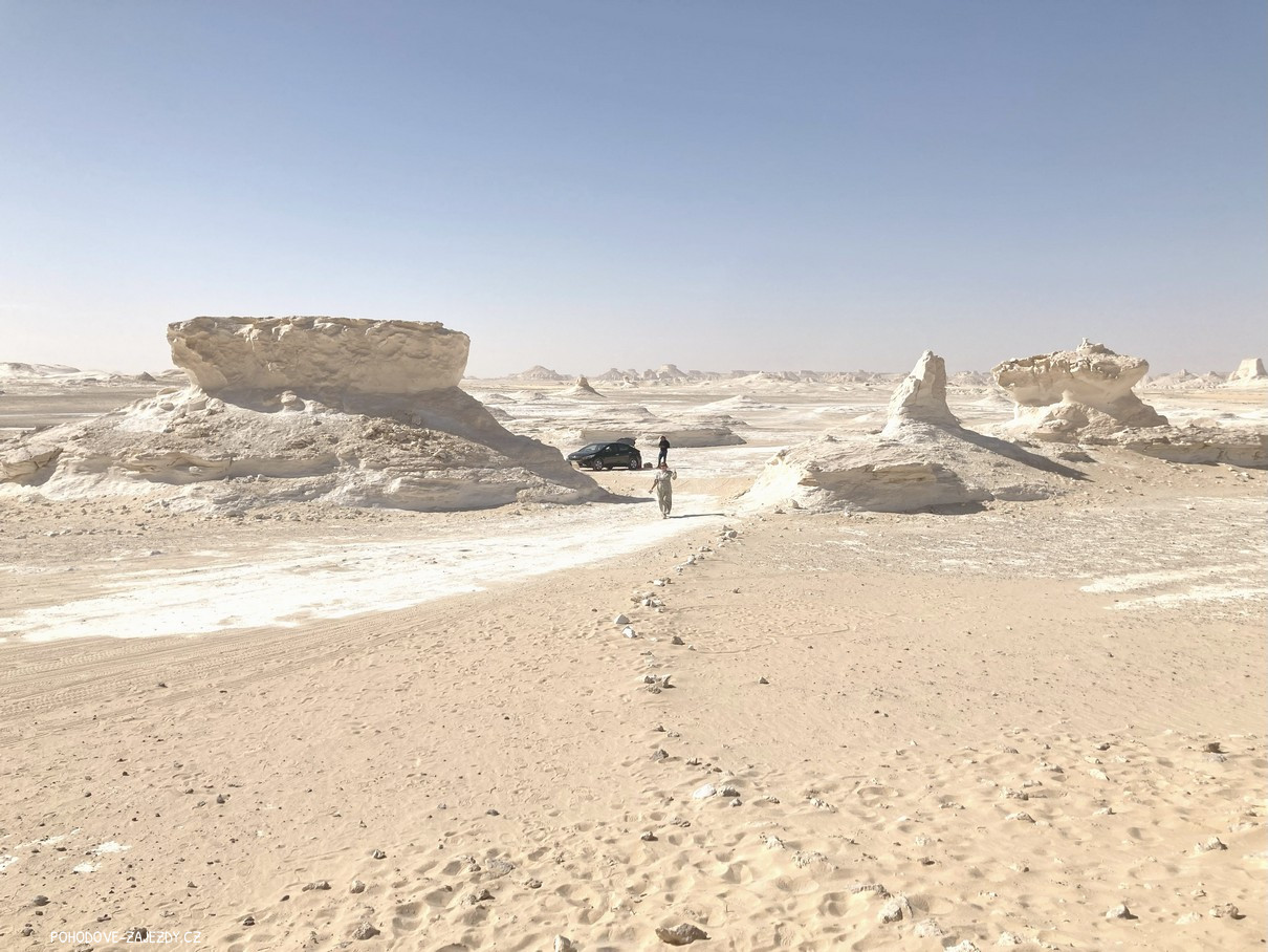 - den Po snídani vyrazíme džípy objevovat poušť a budeme kopírovat stezku starých beduínských karavan, čeká nás magický pramen a přesun hluboko do nitra magické Bílé pouště, kde založíme kemp a čeká nás úchvatný západ slunce a zábava u ohně.