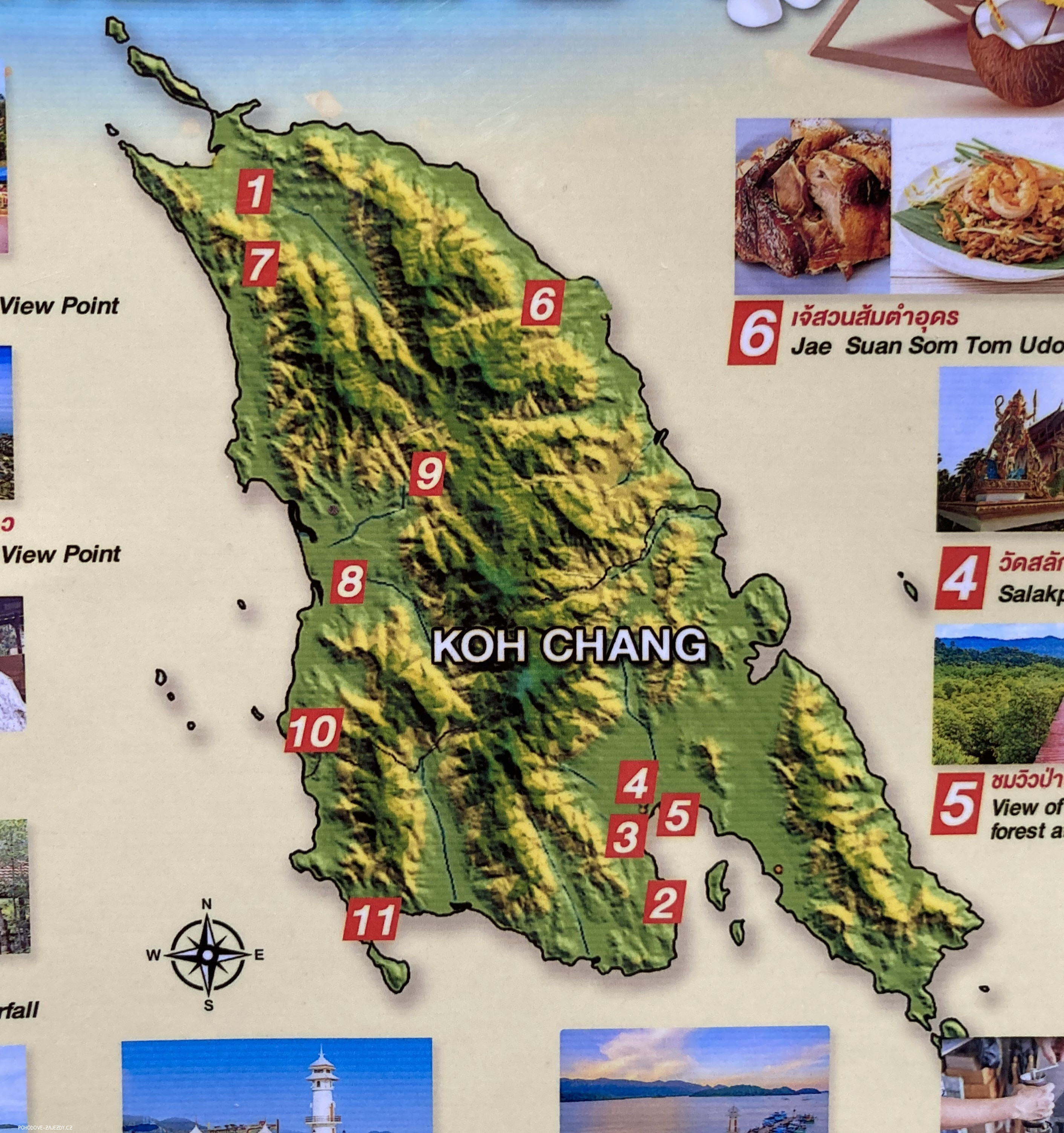 5. den: snídaně, přejezd na ostrov Koh Chang, který leží na východním pobřeží Thajska přímo u hranic s Kambodžou. Je to hornatý ostrov přibližně 30 km dlouhý a 14 km široký. Je známý několika vodopády, korálovými útesy a deštnými pralesy.