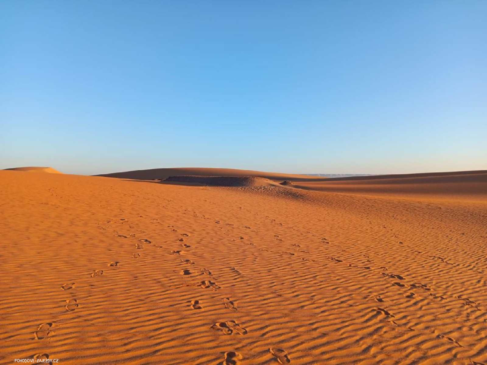 - den: po snídani a načerpání sil pojedeme k Anglické hoře (Gebel al-Ingleez), která je pojmenována podle vyhlídkového stanoviště z první světové války, ze kterého kapitán Williams – britský důstojník – sledoval pohyby loupeživých příslušníků kmene Senussi přicházejících z Libye. Zatímco skromné pozůstatky vyhlídkového stanoviště jsou stále zde, skutečným důvodem, proč sem přijít, je panoramatický výhled na oázu a poušť za ní. Odsud budeme mít možnost sledovat západ slunce. Návrat do beduínského kempu na tradiční večeři.